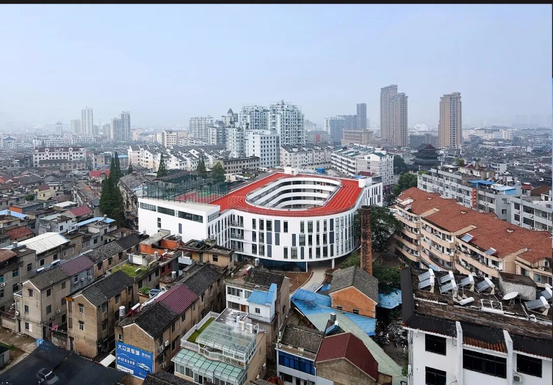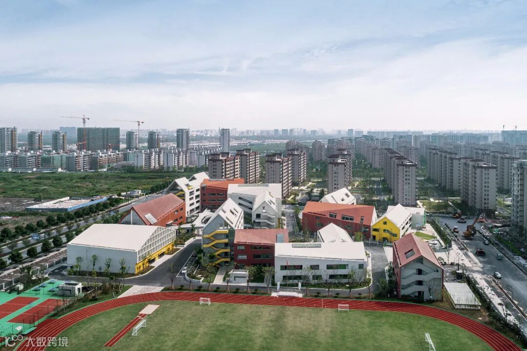 阮:我举一个教育项目的例子。教育是我们非常重要的板块。我们很早之前设计了一个全新的模式,做了一个屋顶跑道的学校,成了吃螃蟹的人,后来被很多项目用了,我们的创意被别人用了,我们不会觉得不舒服,反而觉得特别开心,为大家提供了一种解决问题的模式。我们还做了未来科技城海曙学校。我们做了15栋房子啊,工作量是普通学校项目的四到五倍,其中没有一个立面是一样的,我们试图创造一个小的城镇环境。我们做完之后,很多这类的小房子出现,我们觉得很好,自己做出了一种示范性的动作,对于高密度城市具有积极的价值。