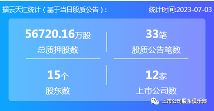 2023年6月30日,股票质押总质押股数56720.16万股,上市公司数12家,股质公告笔数33笔,股东数15个。