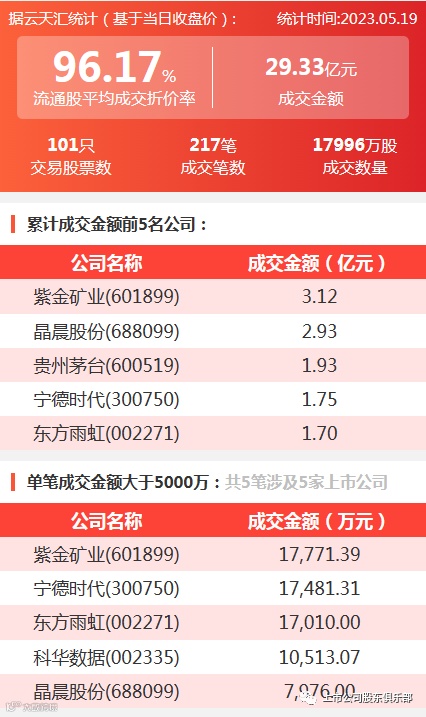 2023年5月19日,大宗交易成交金额29.33亿元,交易股票数101只,成交笔数217笔,流通股平均成交折价率96.17%,成交数量17996万股。