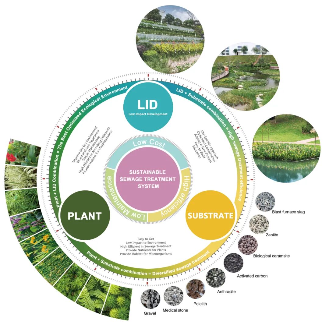 1.将LID设施、植物和基质作为构建低成本高效生态污水处理系统的三大核心要素。
