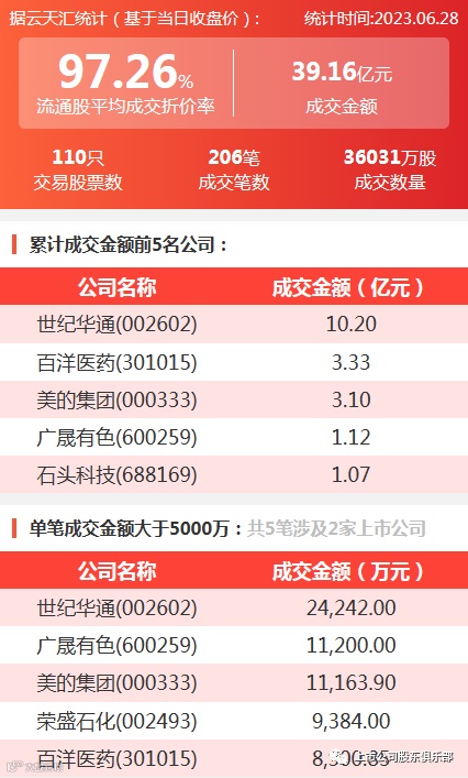 2023年6月28日,大宗交易成交金额39.16亿元,交易股票数110只,成交笔数206笔,流通股平均成交折价率97.26%,成交数量36031万股。