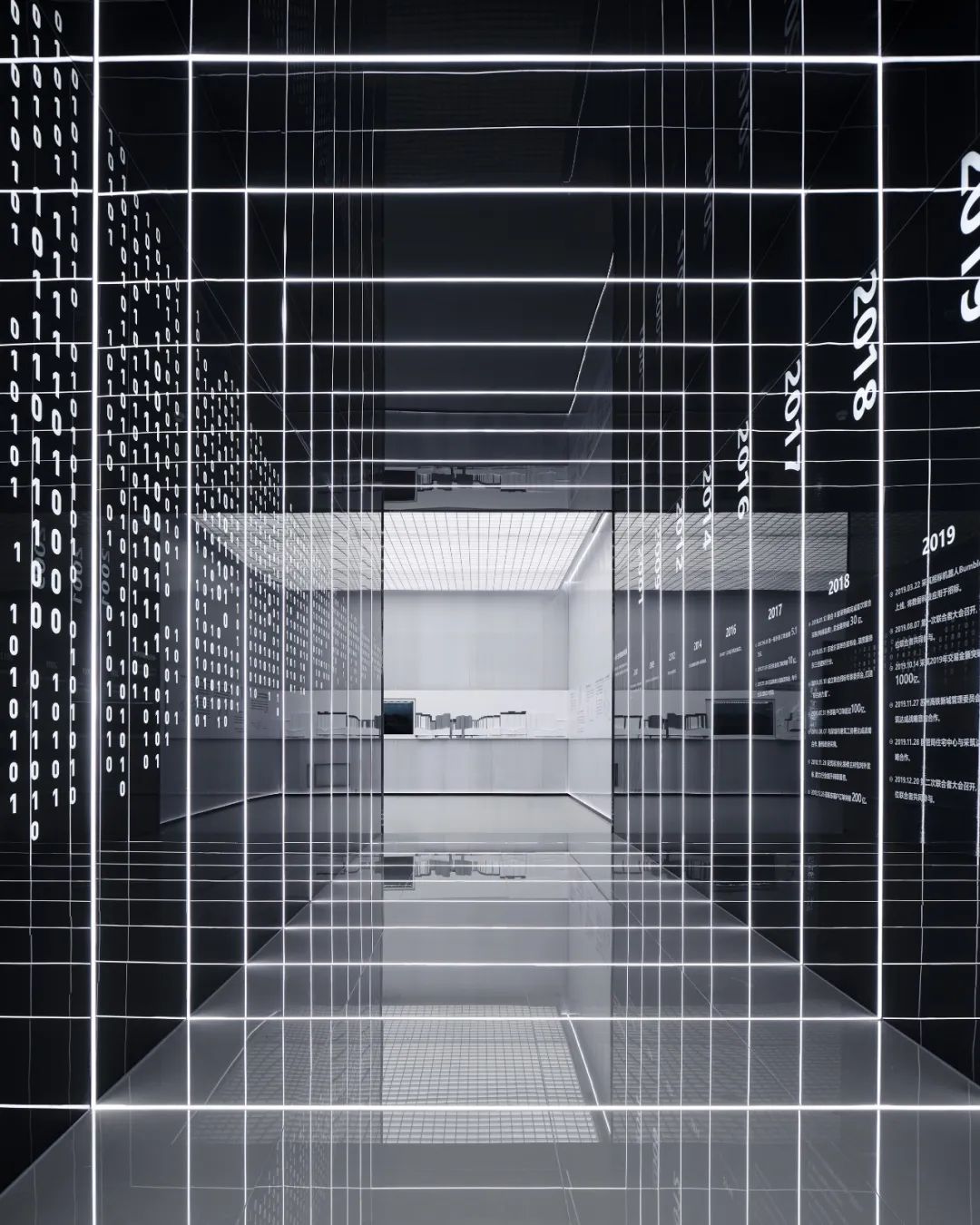 采筑展厅的空间设计延续了建筑设计的特点,以科技联动、阳光生态为主线,通过结合细纱的触感和反重力的视觉感知呈现,将富有金属感与科技感的冲孔金属板以垂吊的形态围绕中庭进行设置,呈现了数据时代的资讯流的重要性,同时也赋予空间新“未来”的活力与思考。