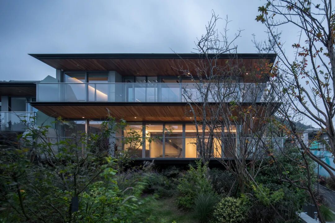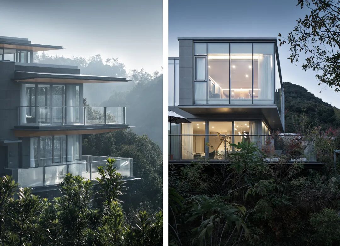 简洁而多样的单体组合使设计显得尤为灵动,我们在此风格基础上配合材质的选用,深色立面与木色吊顶令建筑沉稳地融入山林,而大面积的高透落地玻璃展现了剔透的特质,将山林请入建筑。
