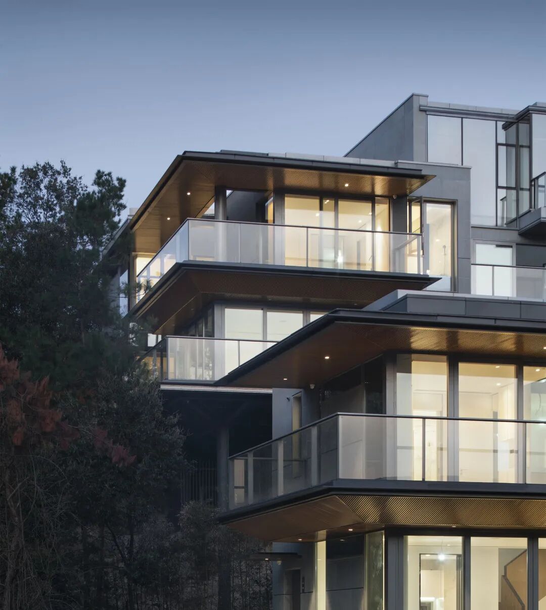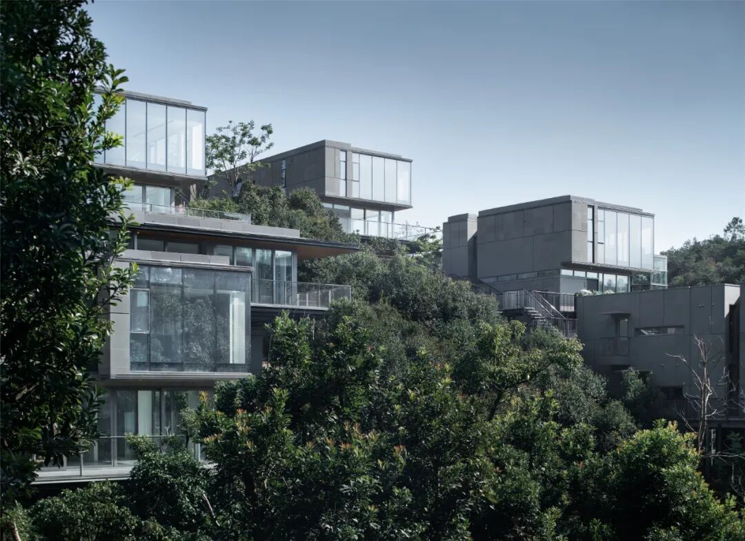在设计师看来,建筑单体就好比被置入山林中的生活容器。照应场地约750米的总面宽条件,建筑形态依山就势,沿坡面轻盈垒叠,缩短进深,保证前后排住宅的开阔视野与基本日照。