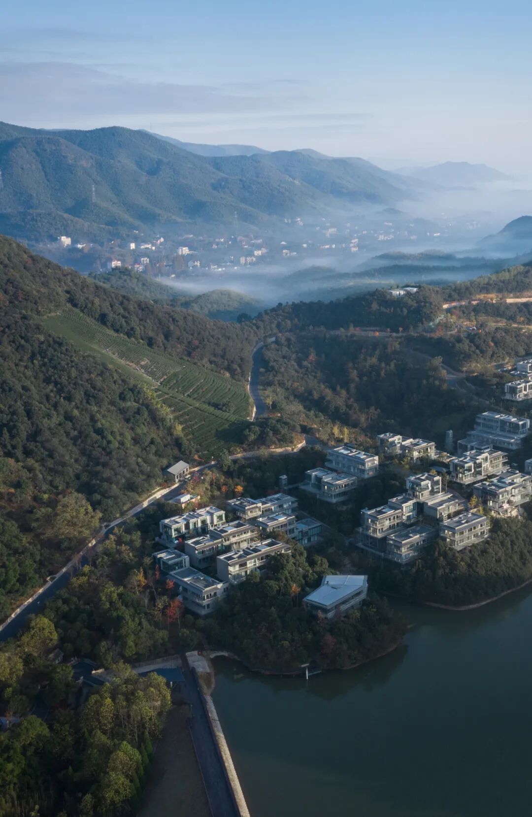 莫干山已是时兴的旅居目的地,作为其周边最具影响力的度假酒店项目之一,郡安里坐落在莫干山镇东北面的长林坞水库。北面A地块基地隐于丛林苍翠的山坳间,面朝近似月牙形的水库铺展,周边并无市政公共道路穿行,俨然一方世外桃源。总体规划铺垫了各区域的功能布局与交通组织,特别的用地红线仍透显于底色之上,触发了我们的深入优化,也使设计过程饶有兴味。