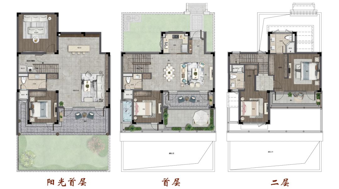 我们还可以看到,户型的设计很大程度的体现了产品的度假属性,它的一二层有超大“空中露台”和阳台,全部朝南,最大面积超30㎡,保证了俱佳的采光和景观效果。