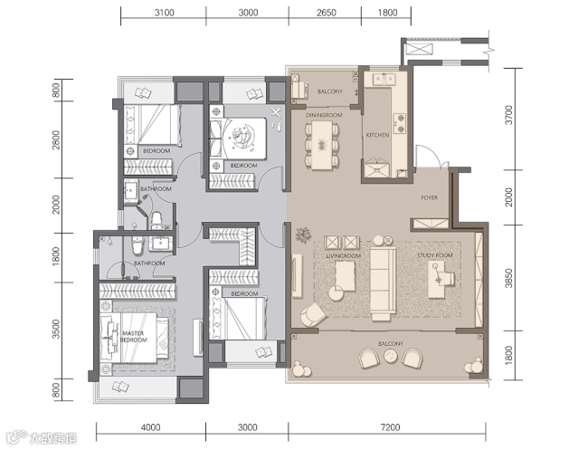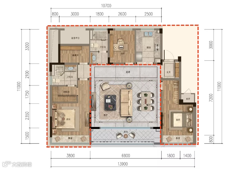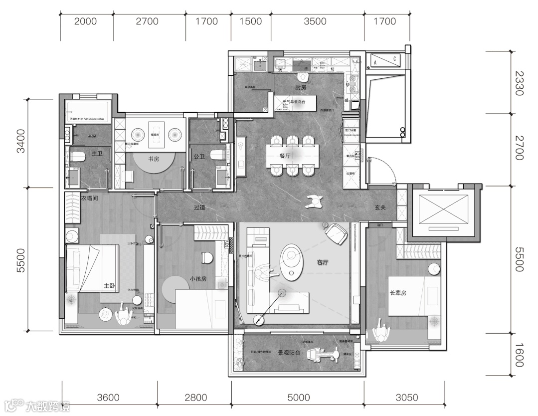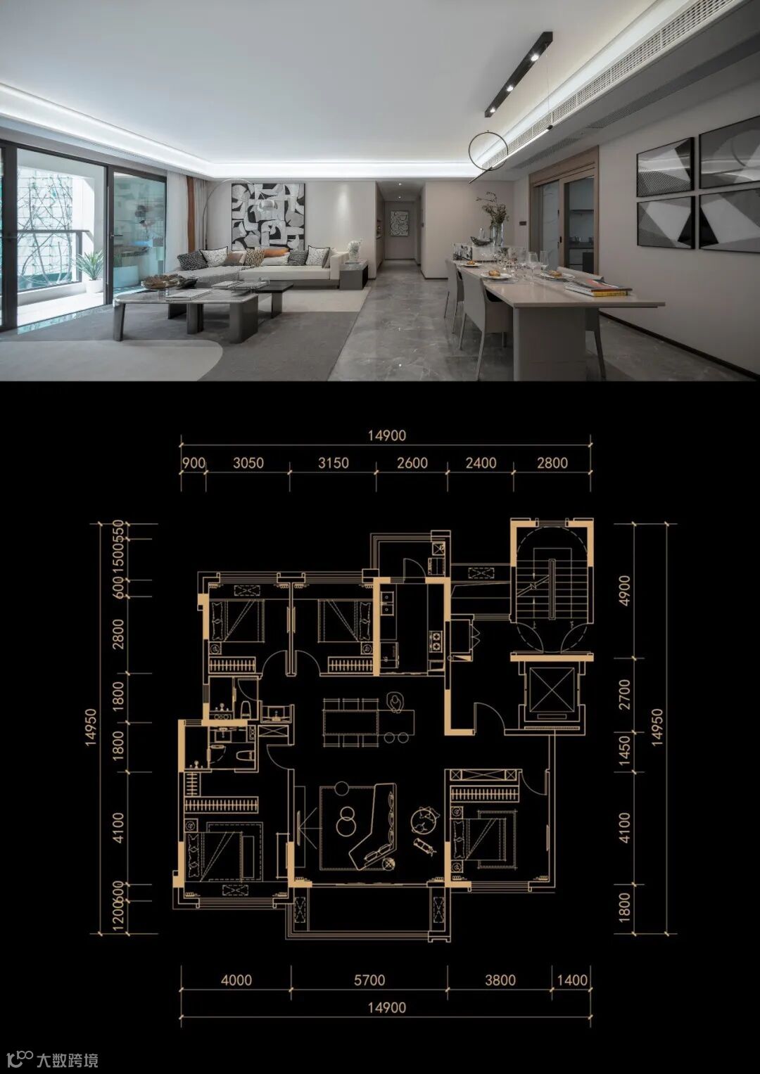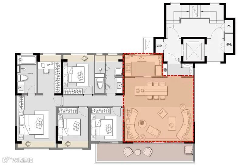 什么是LDKG一体化?就是将客、餐、厨、阳台公共空间融为一体,四大公区保持在一条直线上,这个空间俨然成为了户型里的“C位”。