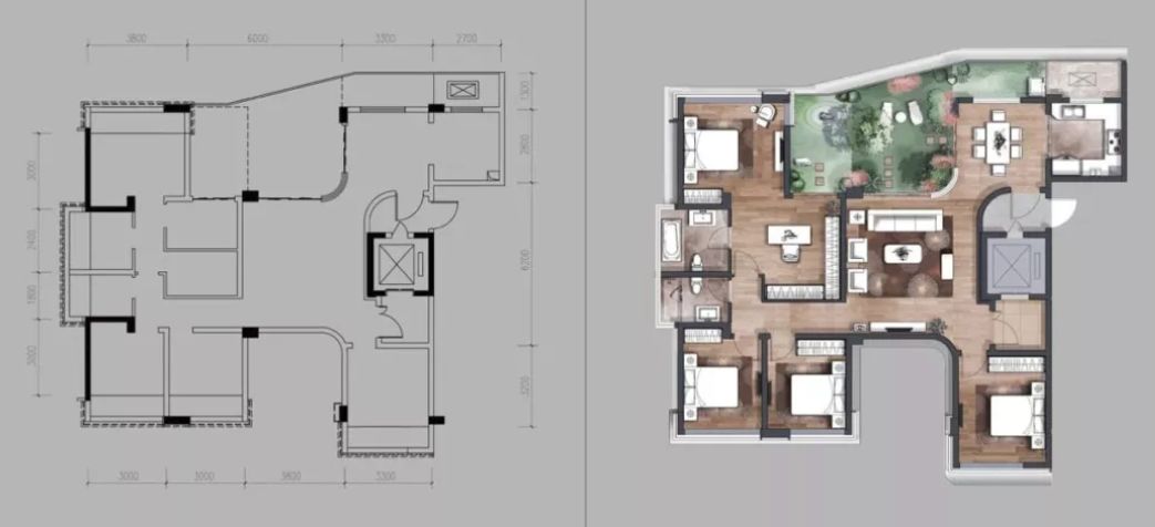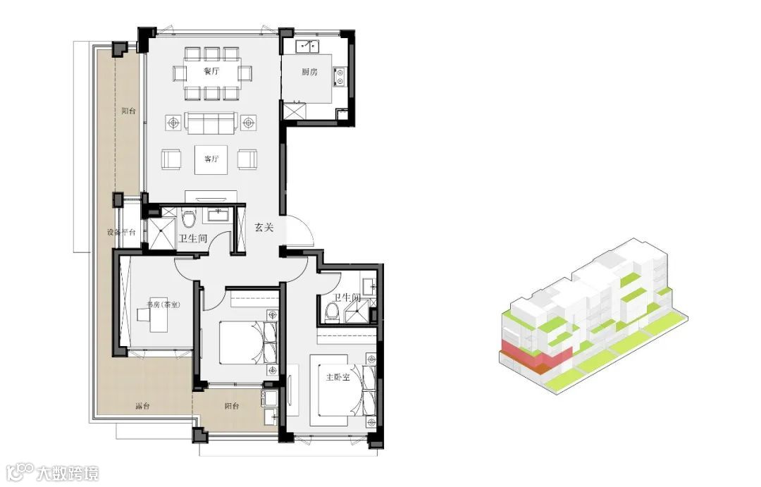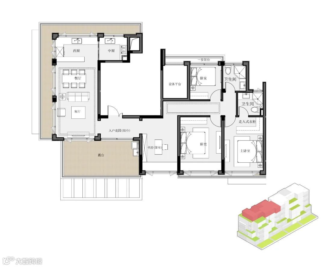 从上图可以看出,户型设计以客厅为中心,客厅左右两侧分别是入户空间、餐厨空间、书房空间以及卧室空间;而客厅的上下两侧,一边是绿色的“空中院子”,而另一侧则是用灰色表示的空间。