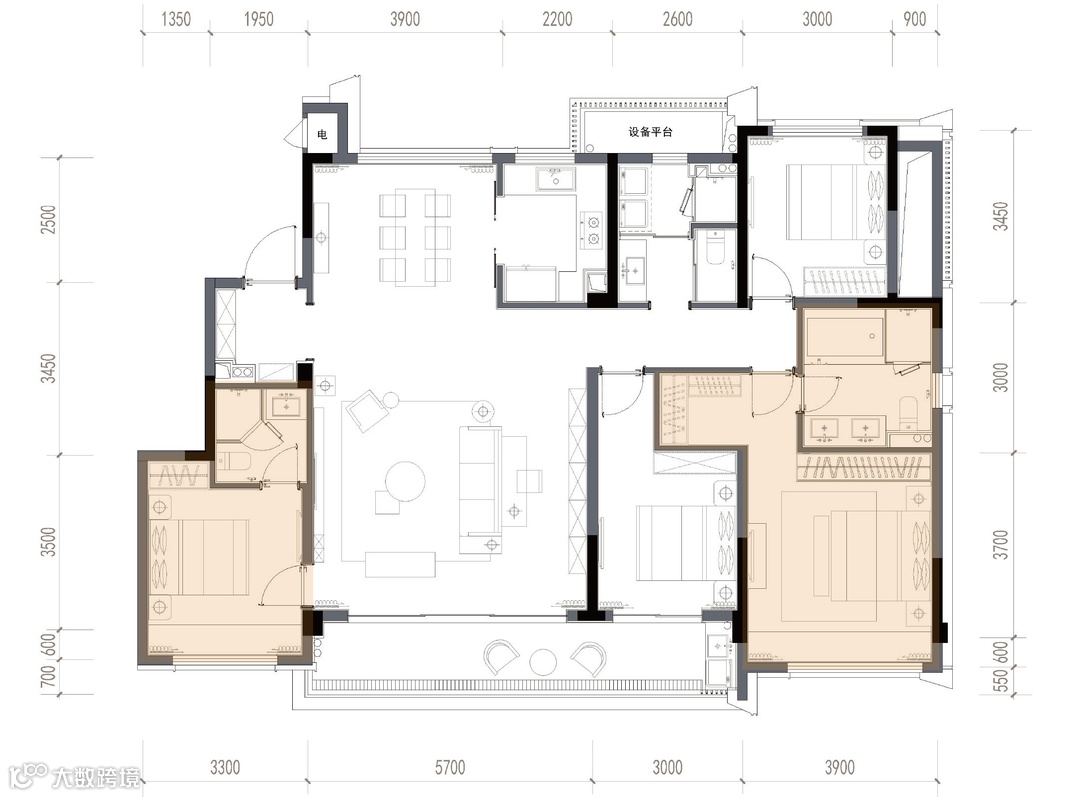 融创云潮府洋房建面约144㎡的户型,四个房间、两个卫生间、一个厨房围绕大客厅排布,形成了一个向下的“凹”字形。