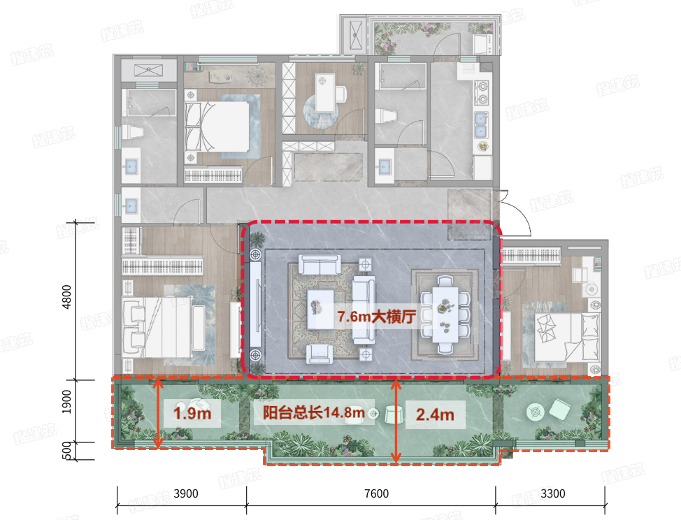 比如他的洋房户型,7.6米大横厅连接约14.8m的观景跑道阳台,活脱脱一个空中花园,不仅宽度大,进深也很不错。