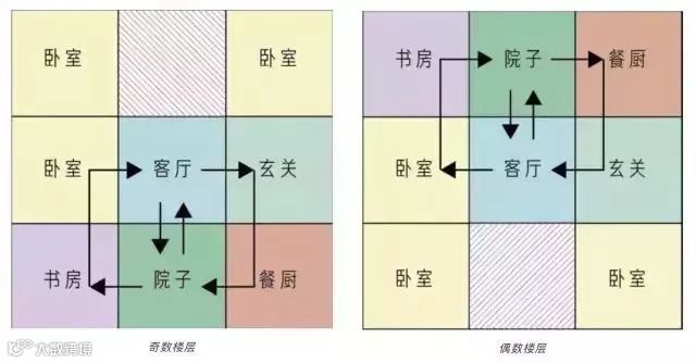 注意灰色的部分,这个空间是不属于这套房子的,奇数层的灰色部分是偶数层的院子上空,偶数层的灰色部分是奇数层的院子上空,也就是说,每家的院子都是向上挑空的,层高可以达到6米以上。