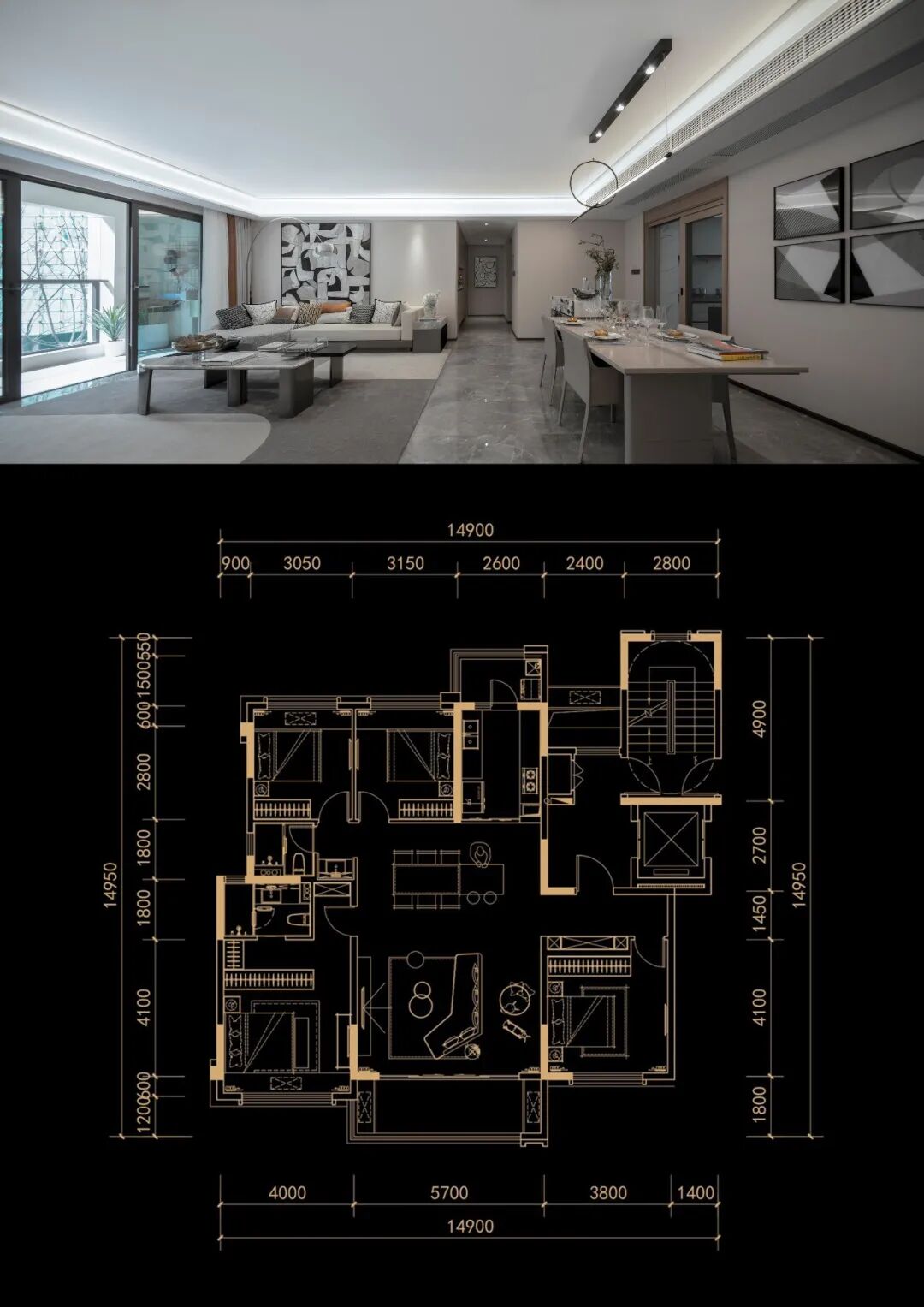户型并非是传统的方块或长方形,而是井字型格局,将室内空间得到了划分,各个空间独立分区。大平层罕见3.15层高,四间卧室布局:两间次卧室同朝向同面积,一间独立的老人房,一间主卧套房。