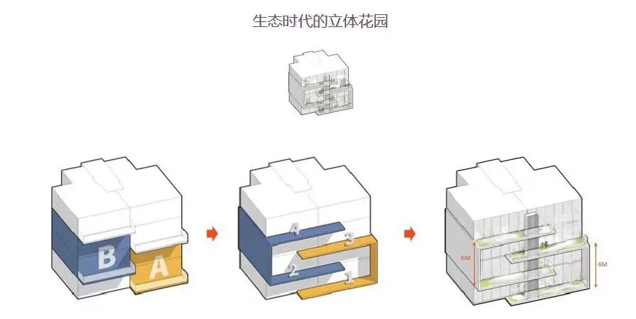 蓝城春风江山陌上花开的墅化洋房,BA设计师在传统洋房产品的基础上开始变异,由下至上,户型由大到小堆叠,形成局部向上收缩的趋势。