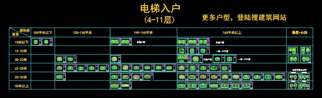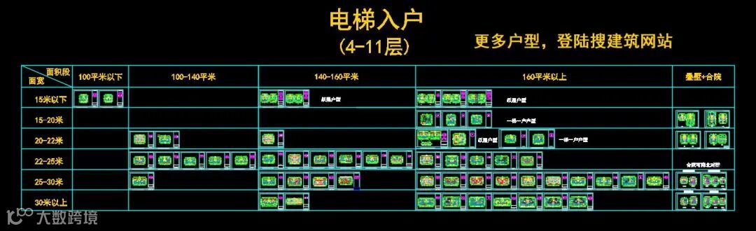 底层户型面积段约115-130㎡。是上层户型内收的基础,通过设置衣帽间,卫生间,阳台等,做满进深。