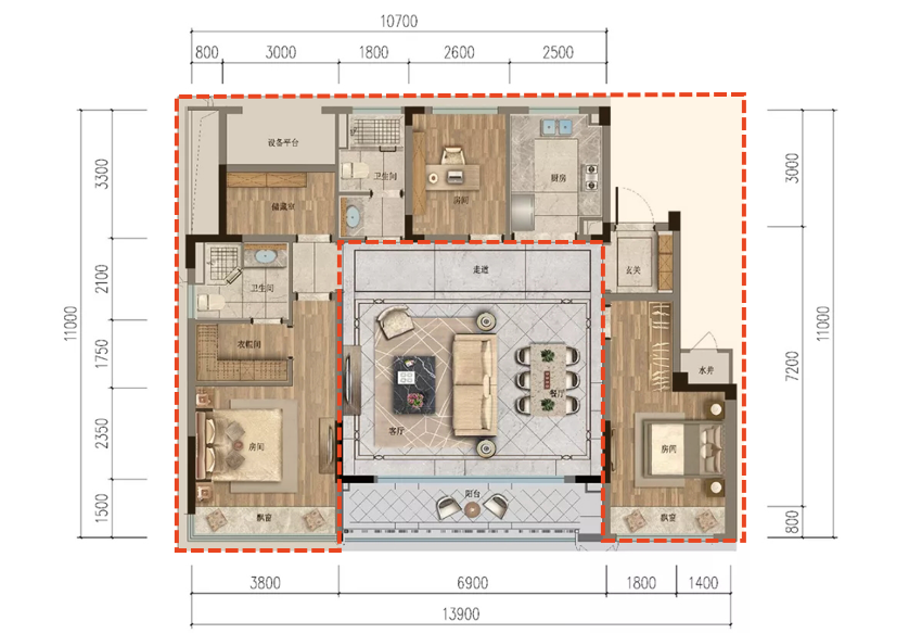 从大平层开始,龙湖就在强化公区一体化,在建面约144 ㎡洋房里,这个一体化有了更进一步的演绎:它把进深做得更窄,但面宽做得更大——既阔绰,又不过分浪费。