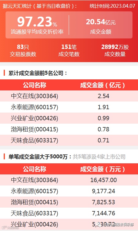 2023年4月7日,大宗交易成交金额20.54亿元,交易股票数83只,成交笔数151笔,流通股平均成交折价率97.23%,成交数量28992万股。