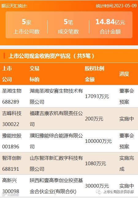 2023年5月9日,资产交易成交金额14.84亿元,上市公司5家,成交5笔,上市公司现金收购资产5笔。
