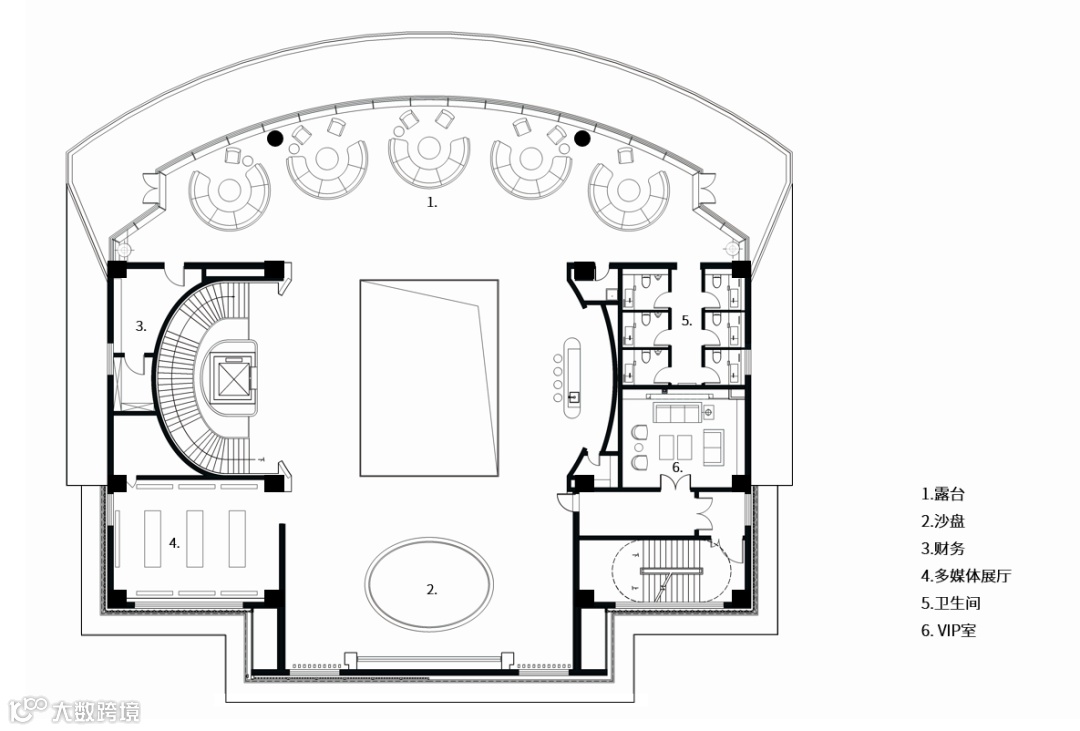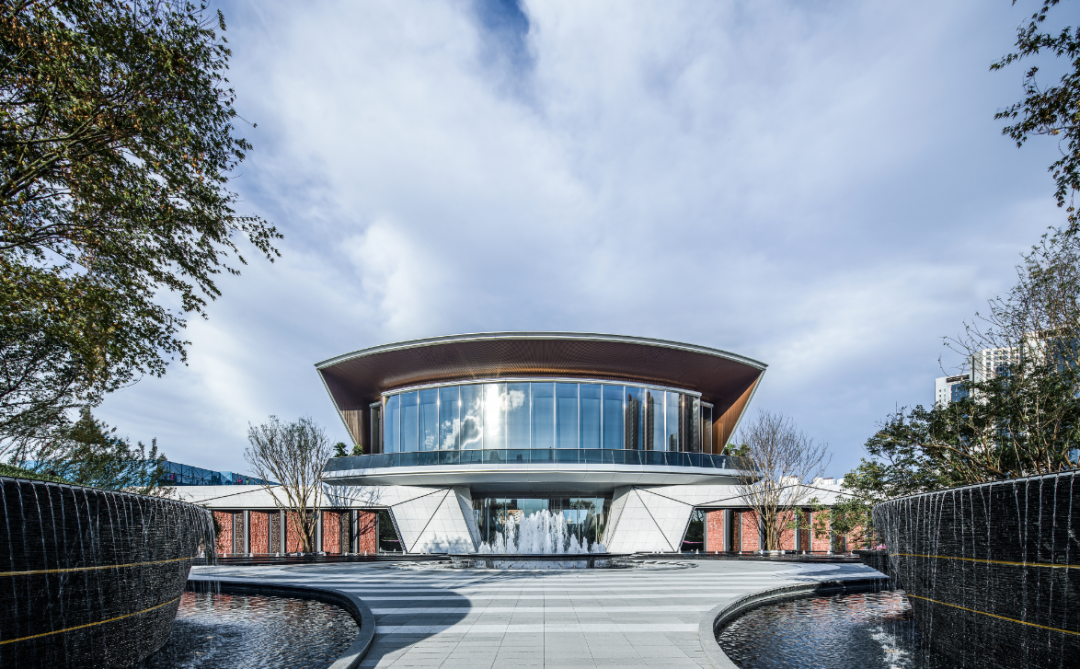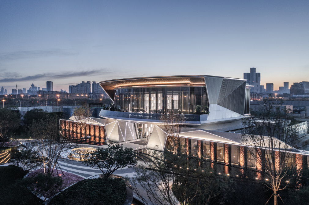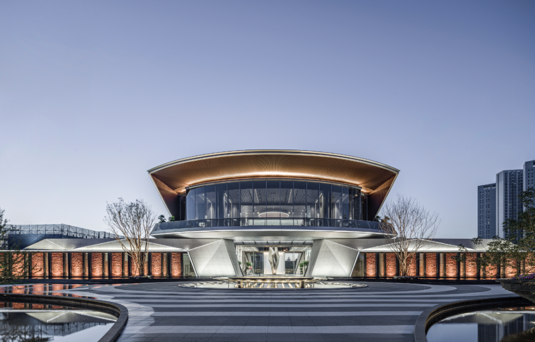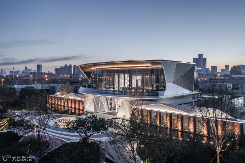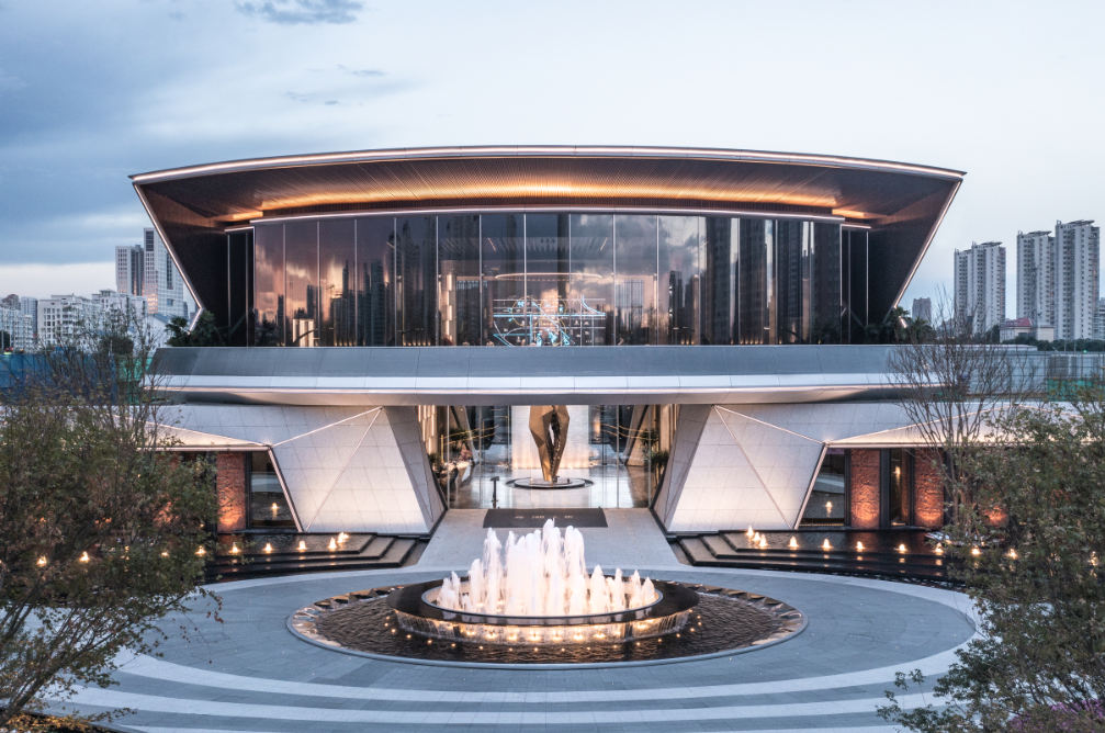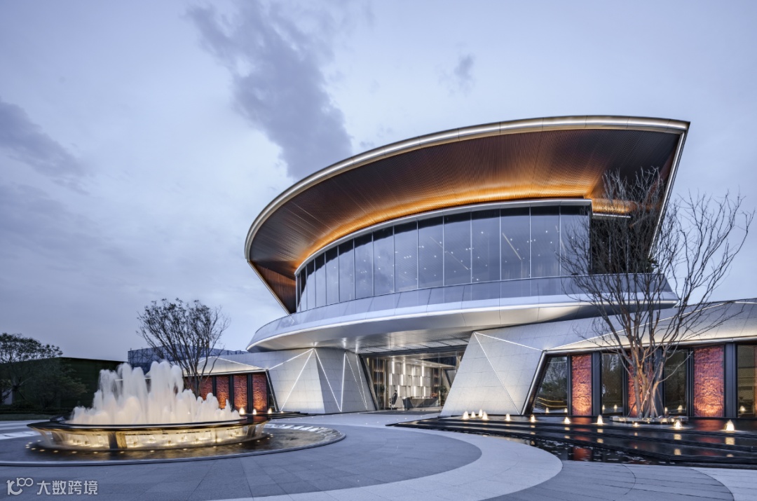我们通过强化线条与色彩材质的冲突感,而呈现一种全限的美学体验。在形体上,建筑上部弧线与下部基座的斜角形成柔软与硬朗的空间较量;在材质上,大面积光洁的玻璃面与基座上粗糙的石材面构成第二次对立。