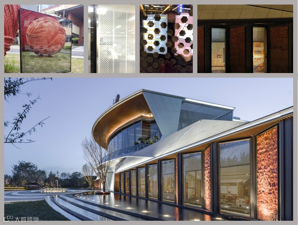 高反射玻璃在白天对绿化景观有效反射,形成绿化景观与建筑的巧妙结合。通过对釉点的1:1打印研究,有效控制内部灯光条件下外面玻璃对于内景的适度过滤。为保证夜景情况下建筑两翼的灯光效果尽量统一,在没有样板房内景的一翼,采用1:1样板房外立面背板喷绘。