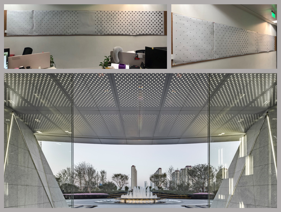 入口穿孔板的设计和做法,经过了过多轮方案数字化模型推导和1:1打印模拟,实现了最佳的入口穿孔板吊顶效果。