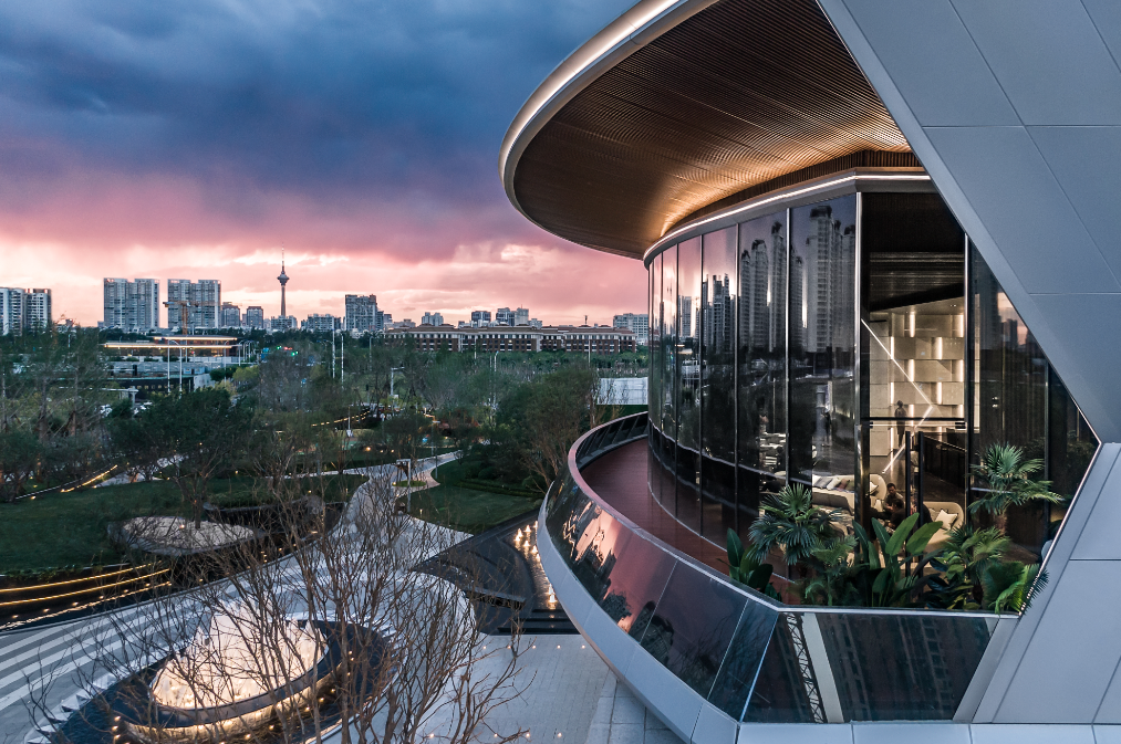 第三重空间作为不同维度的空间被并置于同一个空间线中,由室内过渡到室外,全幅外围景观与城市界面尽收眼底。在时代浪潮奔涌向前的背景下,建筑滋养并更新城市的丰富性与多样性,也见证着其生命的沉淀、更替与发展,正回应了建筑的喻义:领航之心,大观天下。