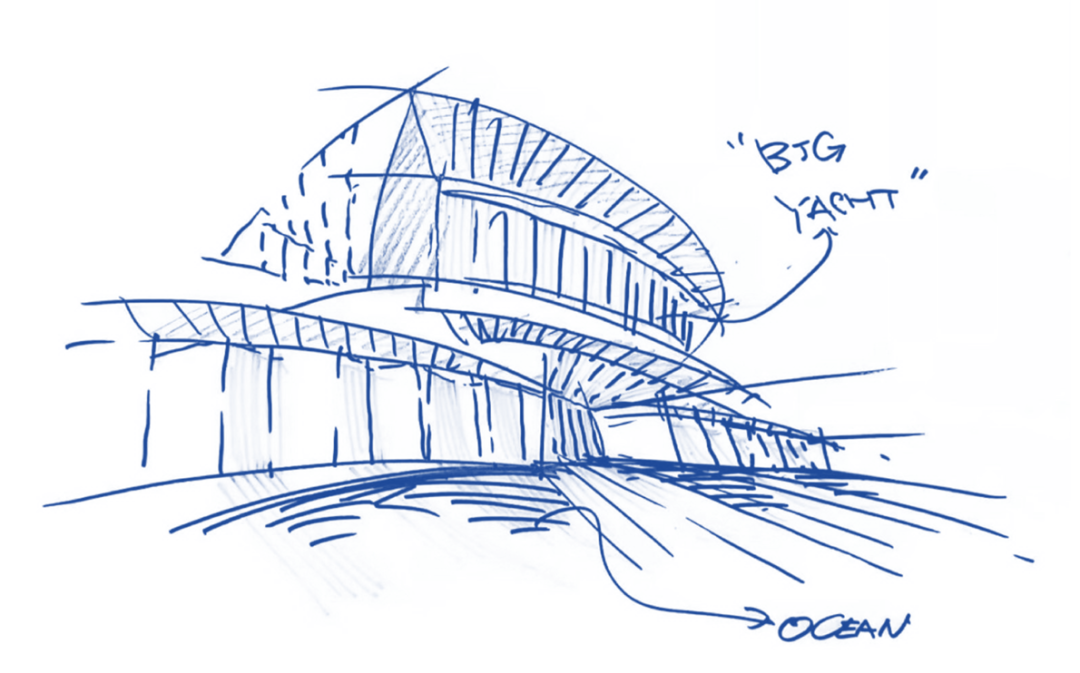 正如柯布西耶在《走向新建筑》一书中表示:当他从轮船中寻找建筑的可能时,他看到的是胆量、纪律、和谐与宁静、活力,还有刚硬的美。从最初构想再到草图勾勒,一座致敬时代的游轮巨艇跃然纸上。