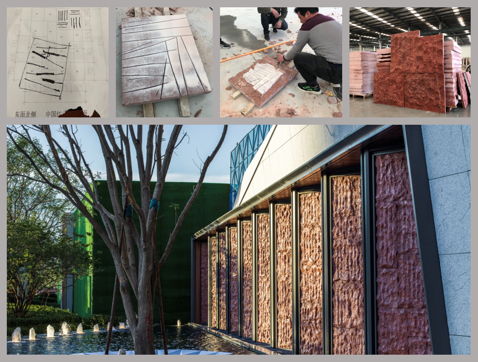 选用福建水头精选红色石材,与专业工匠研究凿毛工艺。定制雕刻石材经过火烧处理去除人工痕迹,并涂刷防护剂提升色彩。通过对材料的精挑细选以及工艺的反复尝试,实现了设计方案的预期效果。