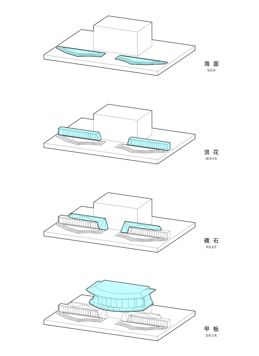 基于对场所的感知,洄游动线依次布置为听海-起航-入境-揽盛-归港五进空间。
