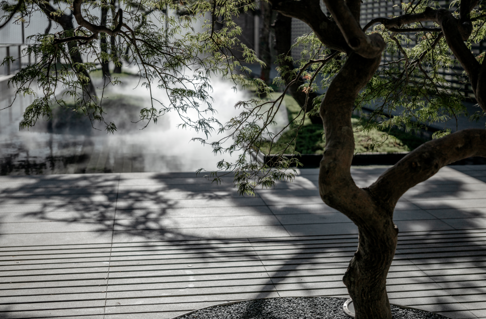 在这座小园,白色的墙,以各种角度,承载着光、掩映出影,为光搭建出最简单又最适宜的舞台。树,伸展开枝桠,以墙为纸,以影为绘,风来,树与影共舞、低语。而弧形的桥,在后方轻盈掠过这一幕场景,幻彩的玻璃屏扇投映下七彩琴键般的落影。