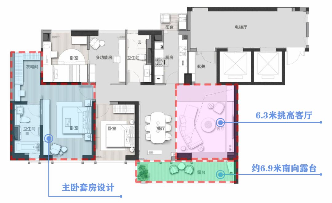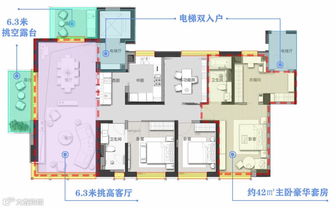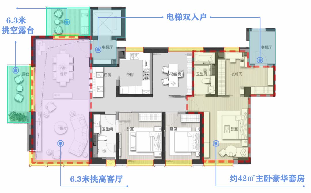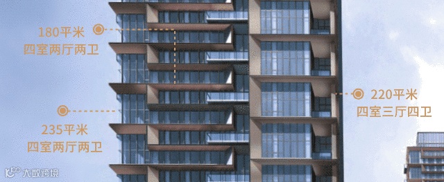 约235㎡四房两厅两卫拥有约21米的超级大面宽、约6.3米的挑空客厅、约6.3米挑空露台全赠送,在大平层豪宅中极为少见。