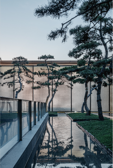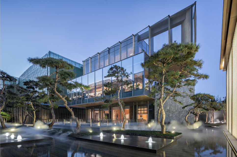 建筑内部的圆形空间,取意于中国传统建筑中的“庭”与“院”的概念,又如中国古时的良渚玉琮,内圆外方,中穿圆孔,贯通天地。