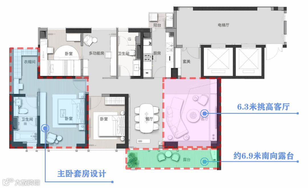 而这样独一无二的错层设计,是为了在约6.3米挑空的客厅里能拥有IMAX级的超级感官,还能实现户户无遮挡的采光与观景视角。
