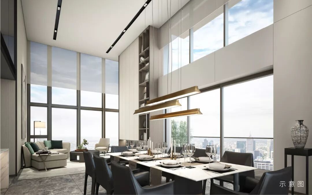 永威上和琚汲取国际一线豪宅的建筑理念,从整体规划、建筑设计、室内营造等多维度考量,抛弃更为节省成本的实体墙面,采用大范围的玻璃幕窗。超大窗墙比,使建筑兼具无边视界与充沛阳光的双重品质。