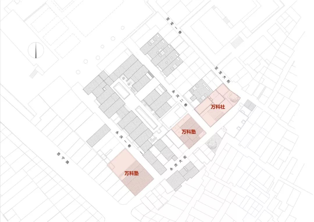 其中,“一纵”为永庆大街,微改造以其为主要展示面,布置特色商业,引导人流进入;“两横”为永庆一巷和永庆二巷,微改造保留原有历史文化建筑,植入公共建筑及少量商业。