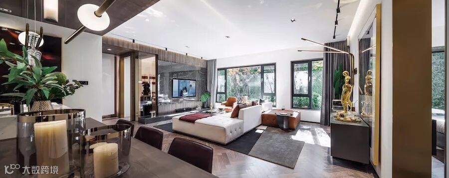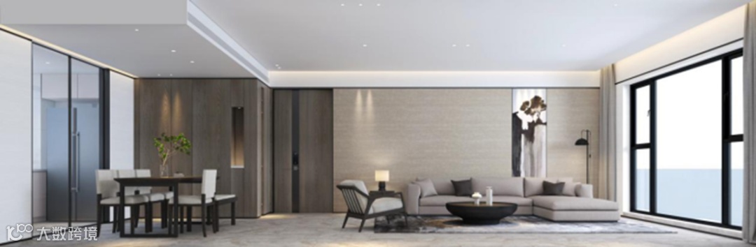 独立电梯厅+入户玄关,无论收纳空间还是归家仪式感都做得很好,客厅采用了边厅设计,面积高达约46㎡,开间约5.7米,进深约8米,270°采光,拥有约10m+的采光面,充分利用社区及周边的景观资源,创造了无边界的视觉效果。