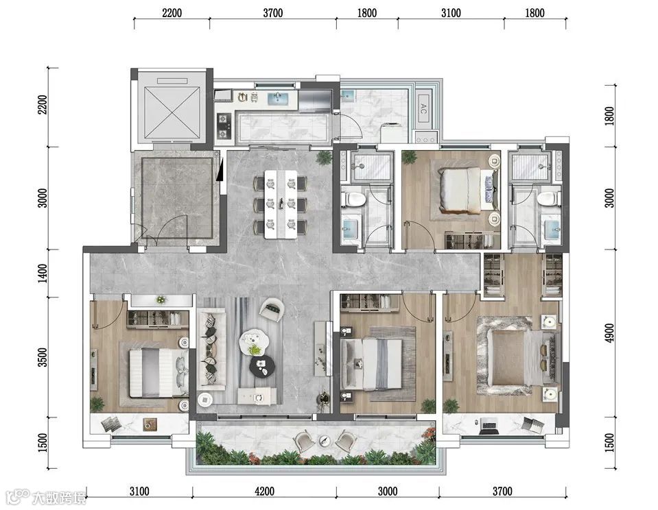 杭州融创云潮府洋房建面约144㎡的户型,四个房间、两个卫生间、一个厨房围绕大客厅排布,形成了一个向下的“凹”字形。