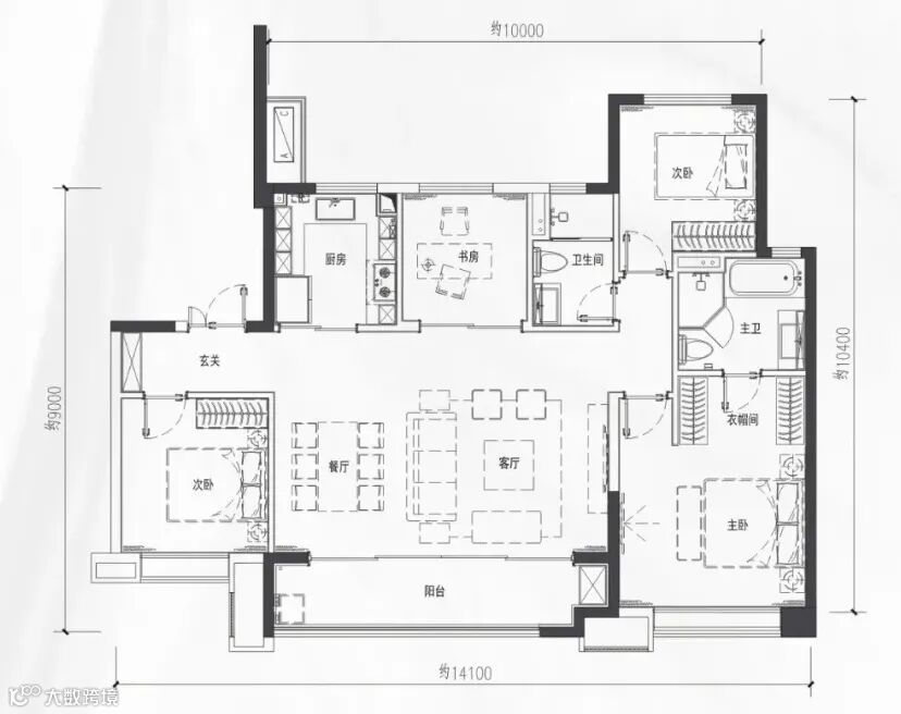 成都龙湖西樾锦宸建筑面积约140㎡户型4房设计,整体面宽约14米。