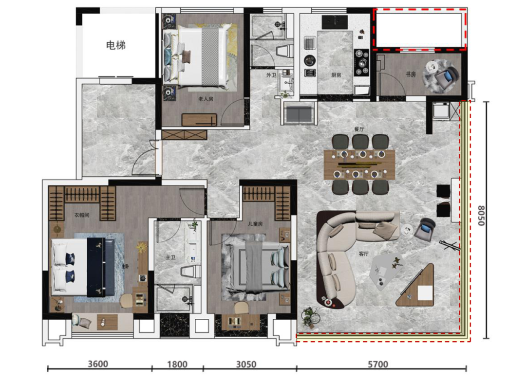 双联跑道式阳台有约7.5米,南北通透的设计,主卧套房带有步入式衣帽间,面宽更是达到了约3.9米。
