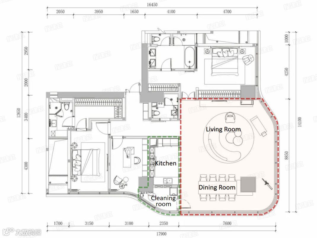 百余平米的边厅能有23种生活场景:一家人有了很好的互动空间,比如超大中西厨房,向往的烹饪生活;餐厨一体,能轻松容纳家族以及各类聚会需求;100多平米的复合功能客厅,各类party,所想所得。
