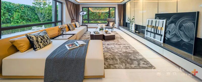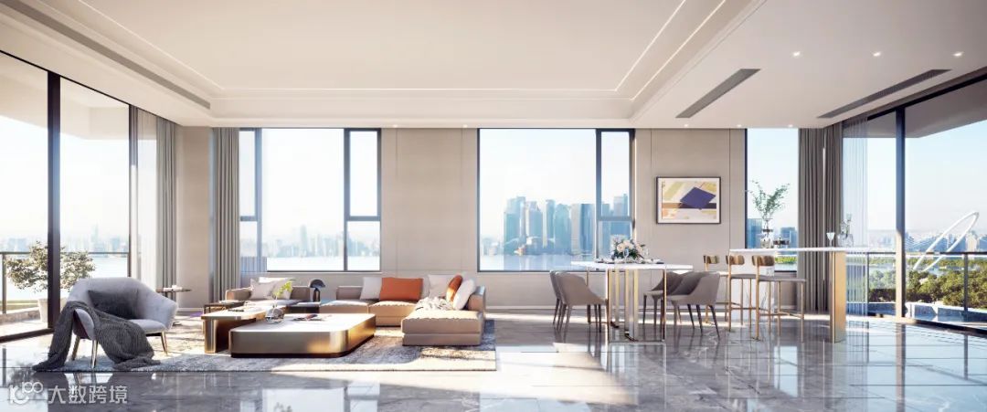 取消了过往客厅和阳台间的那道滑门,让客厅和阳台连成了一片,一个尺寸达到13.5X10米、使用面积达到135平米、两面落地玻璃270度采光、正看两江交汇的会客厅,是一种什么样的气场?
