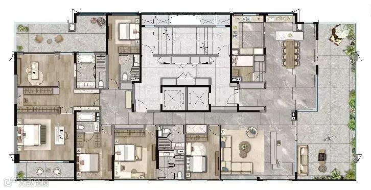 再来看一个带L型大阳台的边厅户型,景观视野更佳: