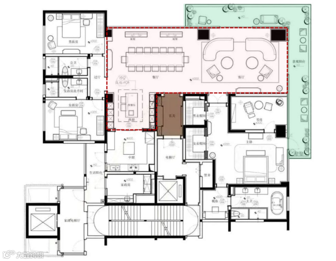比如北京中海甲叁號院,厅的面积高达100平,所有的公共空间全部都是互通的,所以把厅做大家庭成员之间无论处在哪个区域,都能时刻保持着很好的交流。
