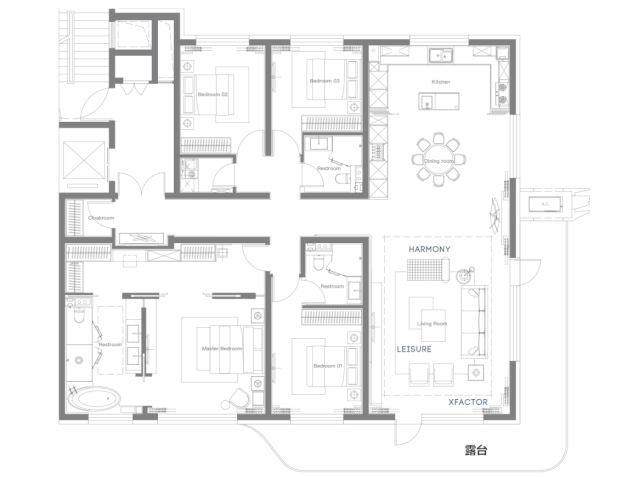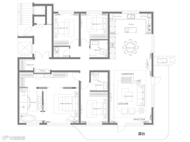 动静分区的双十字动线,12m*7m的家庭社交区域,外加20余米的L型阳台,气场强大。