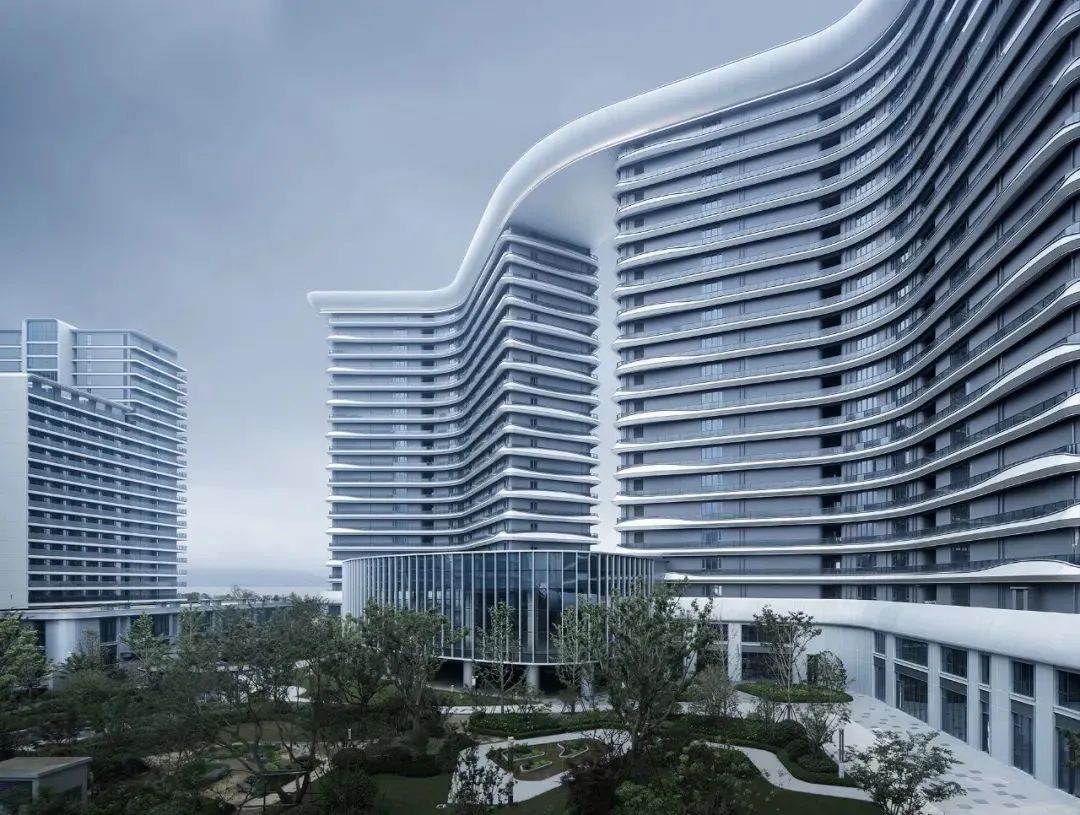 如,杭州融创金成 · 杭京源,建筑师孟凡浩的设计跳脱出传统正交标准化住宅体系,以“超流体”为概念,“一滴水的时空游动”为创作灵感,借由水的流动性、包容性、承载感,呈现融合东方韵味的当代建筑语汇。注重功能、体验与美学并重,立面形式完全契合于平面功能。