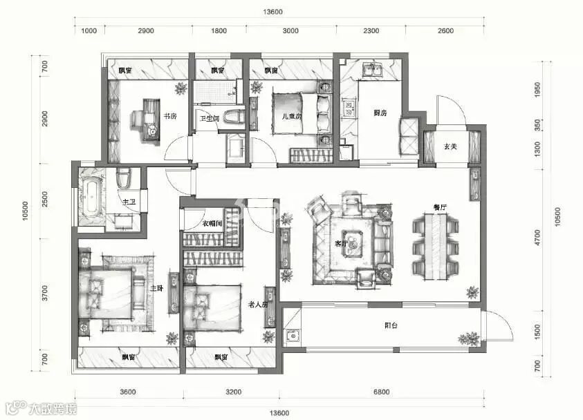 这个户型最大的亮点还不是这个,而是整个采光面达到了10个,而且还带有5个飘窗,可以想象,这个户型舒适度还是蛮高的。主卧更是带独立衣帽间、独立卫生间。
