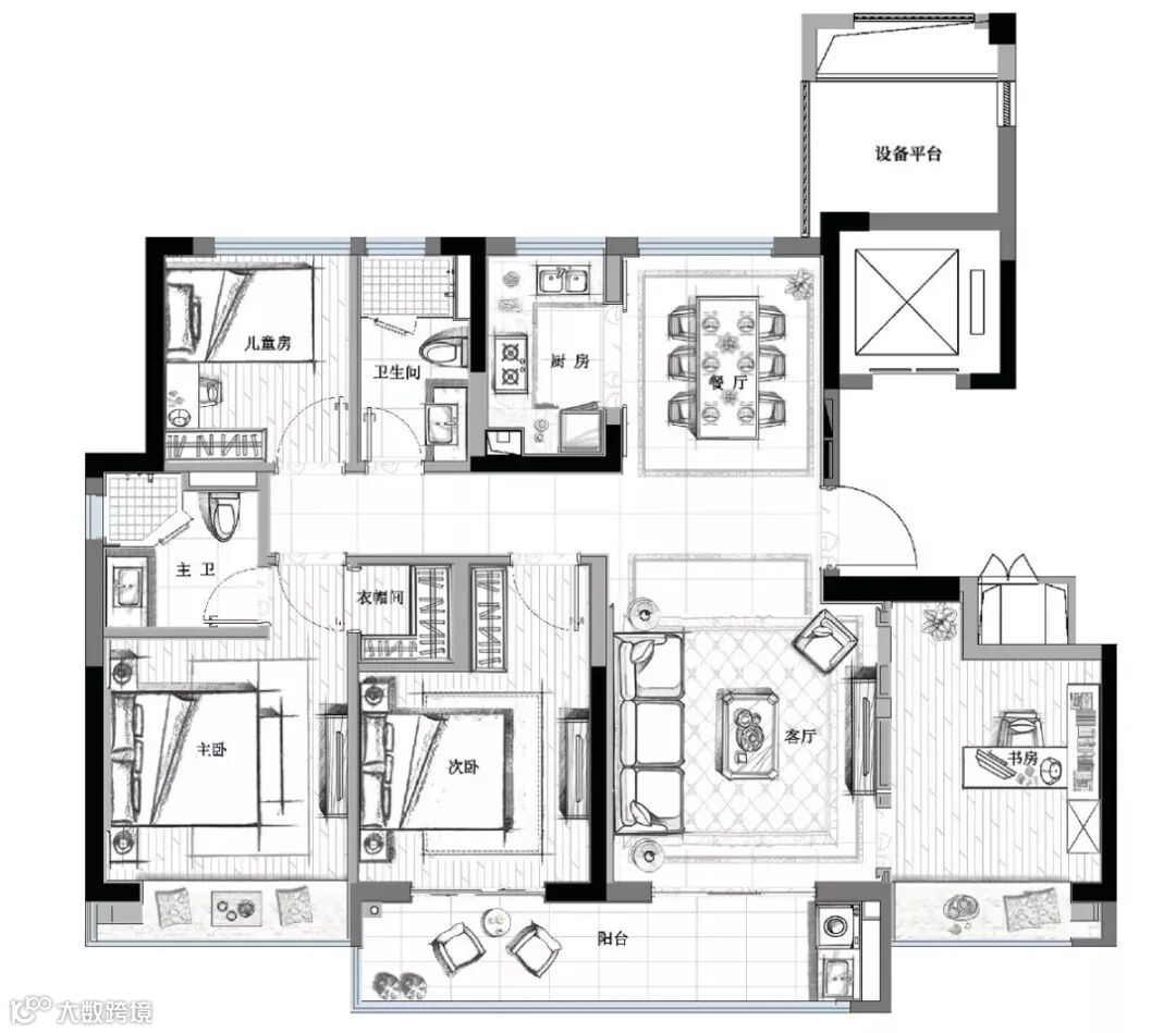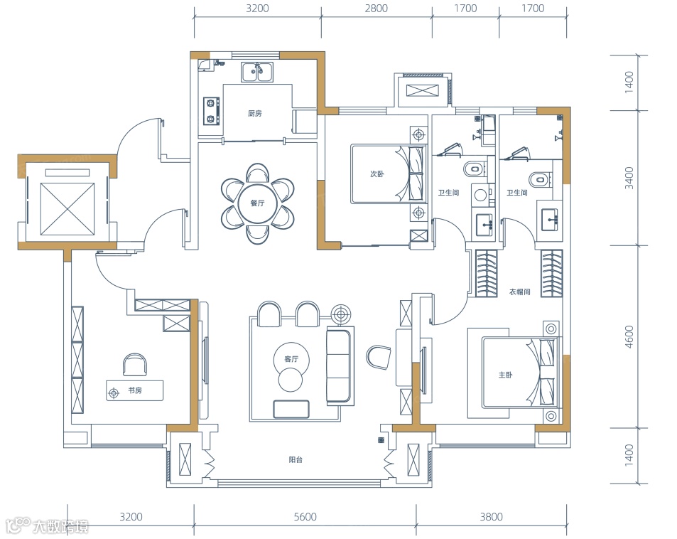 宁波大家·上宸建筑面积约128㎡的户型,做到了四房两卫,全明户型。四开间朝南,南向面宽到了约13.5米,书房、客厅、次卧、主卧均朝南而设。
