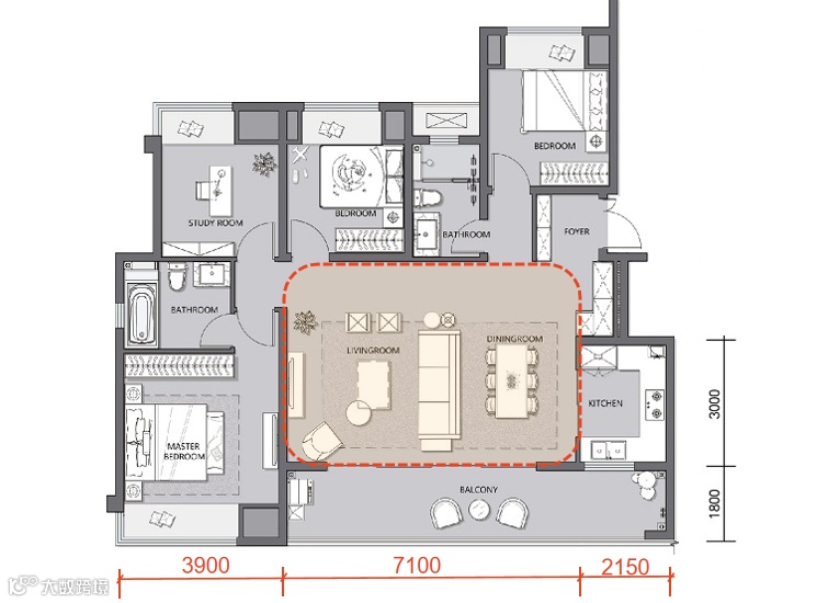 重庆绿地听江左岸建面约128平的多功能洋房,主面宽达到了宽敞的12.6米,整个公区LDKG一体化设计,面宽约7米宽厅+面宽约1.95米的厨房,外连同宽阳台,这样的设计舒适度极高。