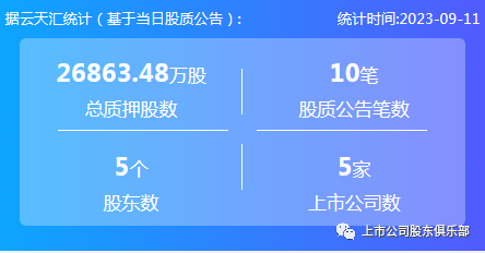2023年9月11日,股票质押总质押股数2.68亿股,上市公司数5家,股质公告笔数10笔,股东数5个。
