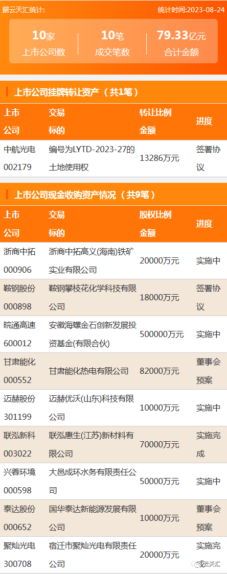 2023年8月24日,资产交易成交金额79.33亿元,上市公司10家,成交10笔,上市公司挂牌转让资产1笔,现金收购资产9笔。