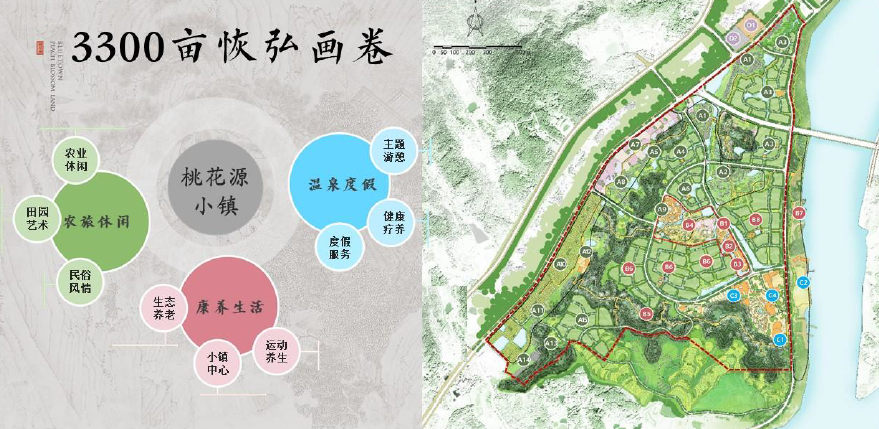 体验丰盈的桃花源式生活:高端温泉酒店、水上乐园、度假村、健康管理中心、全龄教育中心、生活服务中心、农业休闲、田园艺术、民俗风情街......几乎囊括用户度假生活的全部场景需求。
